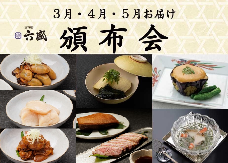 六盛の厨房にて調理したお料理、六盛の味を、月に1度3ヶ月にわたってご自宅へお届けします(2人前)。