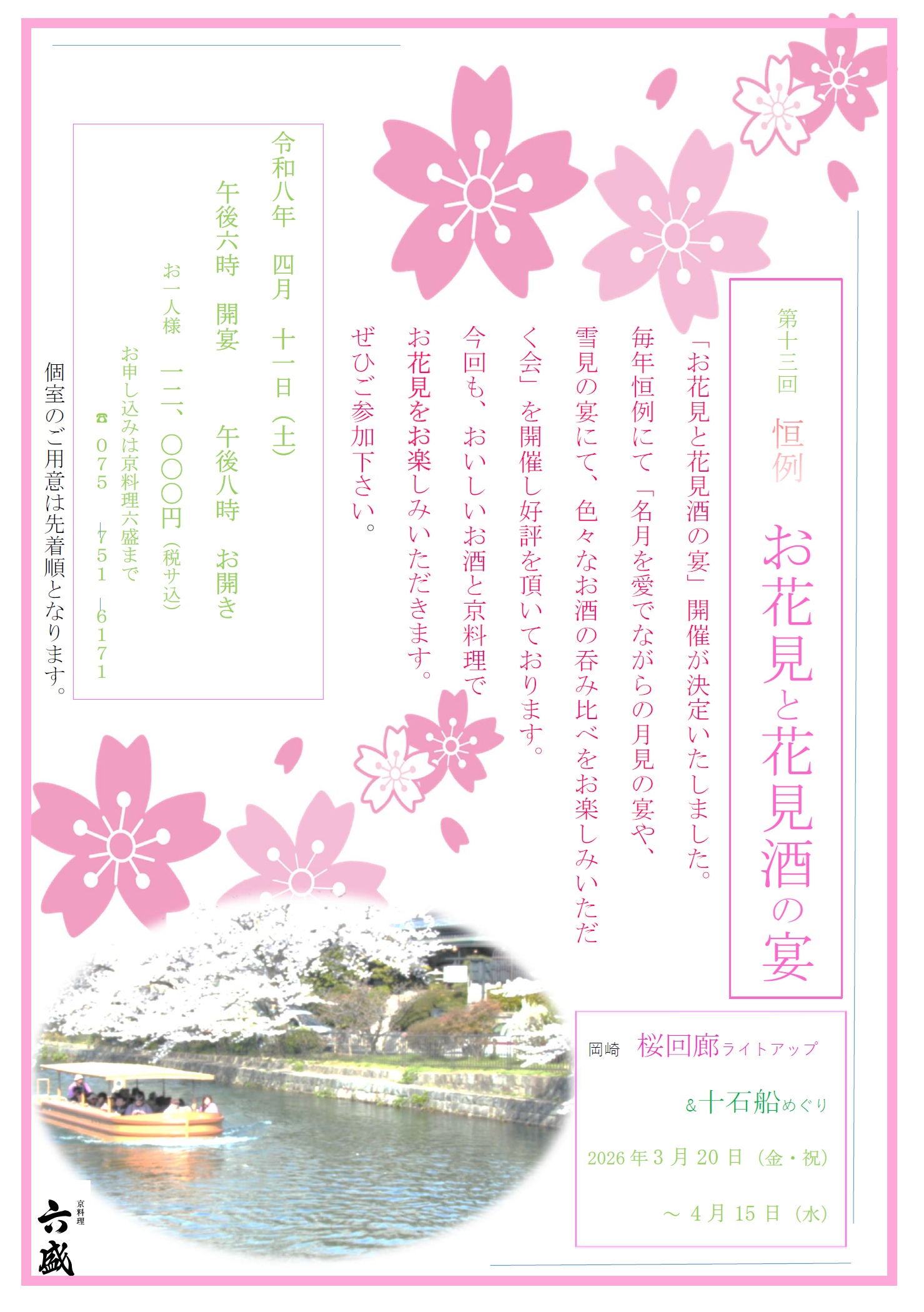 4月11日(土) 18時開宴 20時お開き お料理とお酒 12,000円(税サ込)